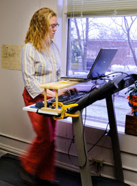 The college that I work for ran a brief blurb in the weekly newsletter. This is the accompanying picture, which I love because you can see the movement in my legs and fingers (blurry), but my head, face, and upper body look perfectly still. Life @ 1.4mph = pure bliss and total productivity.